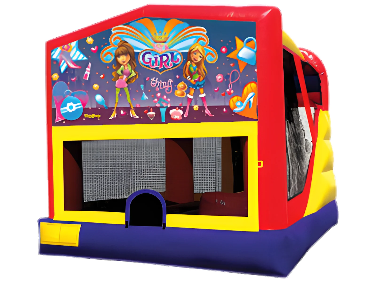 A colorful “It’s a Girl Thing”–themed bounce and slide combo featuring a spacious bounce area, an interior slide, and a basketball hoop for stylish, high-energy fun.