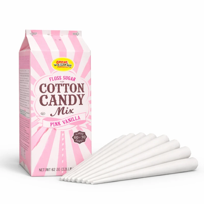 Each bundle includes a full carton of Pink Vanilla floss sugar plus 50 paper cotton candy cones, making it ideal for parties, school events, fundraisers, and backyard celebrations.
